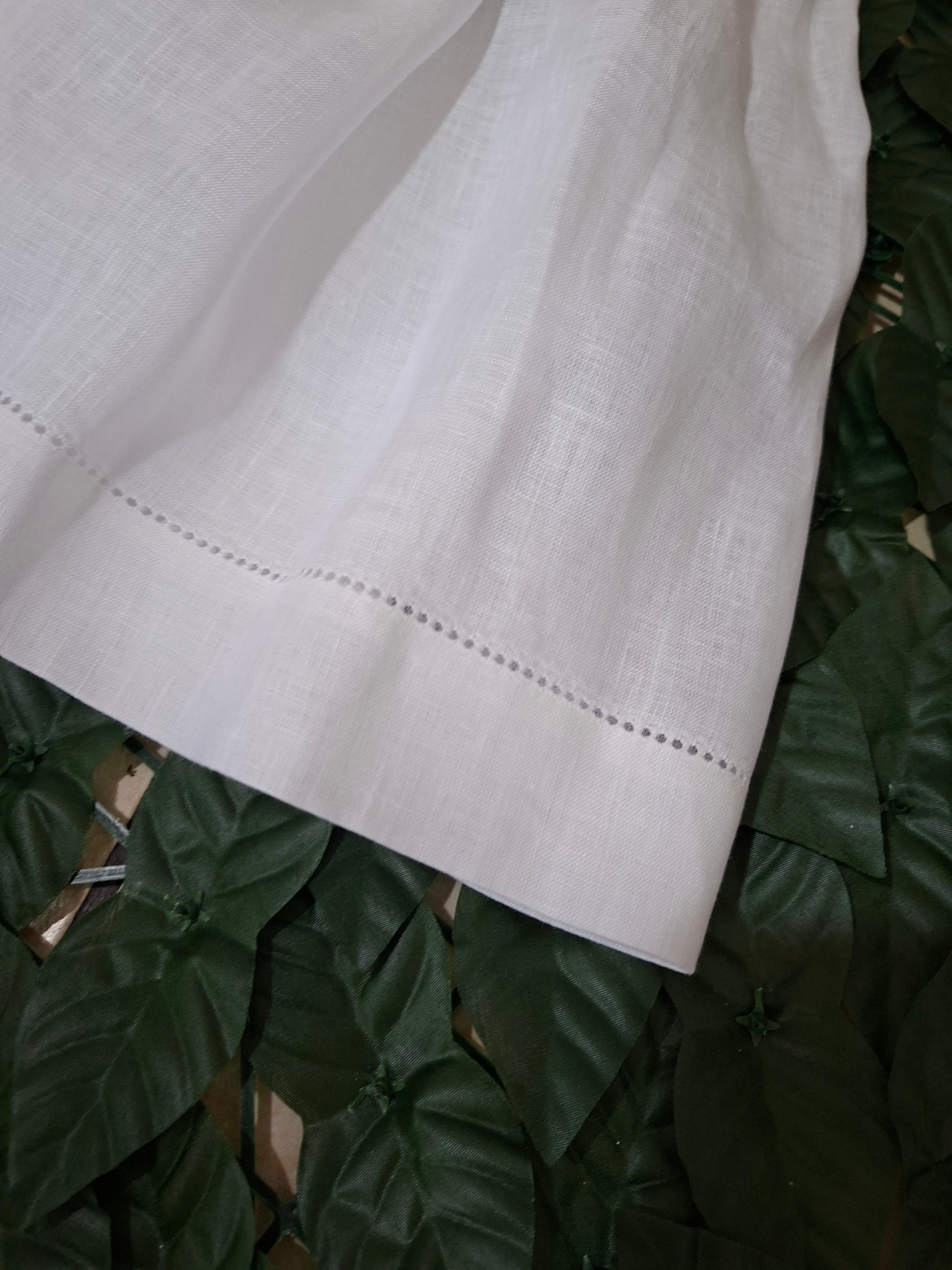 Abito in puro lino con ricamo a nido d'ape sull'orlo , e fiocco sul petto a contrasto di colore.
