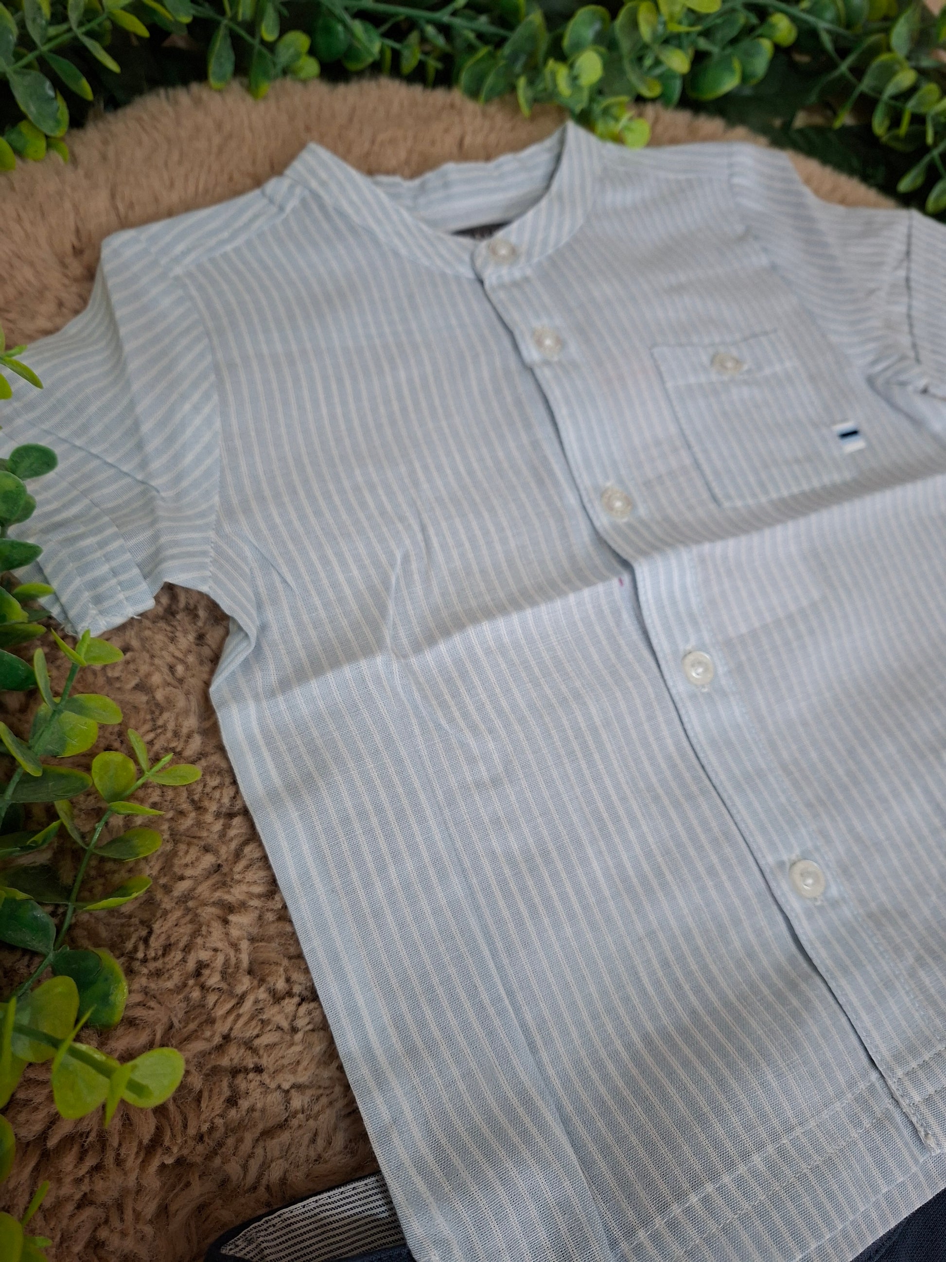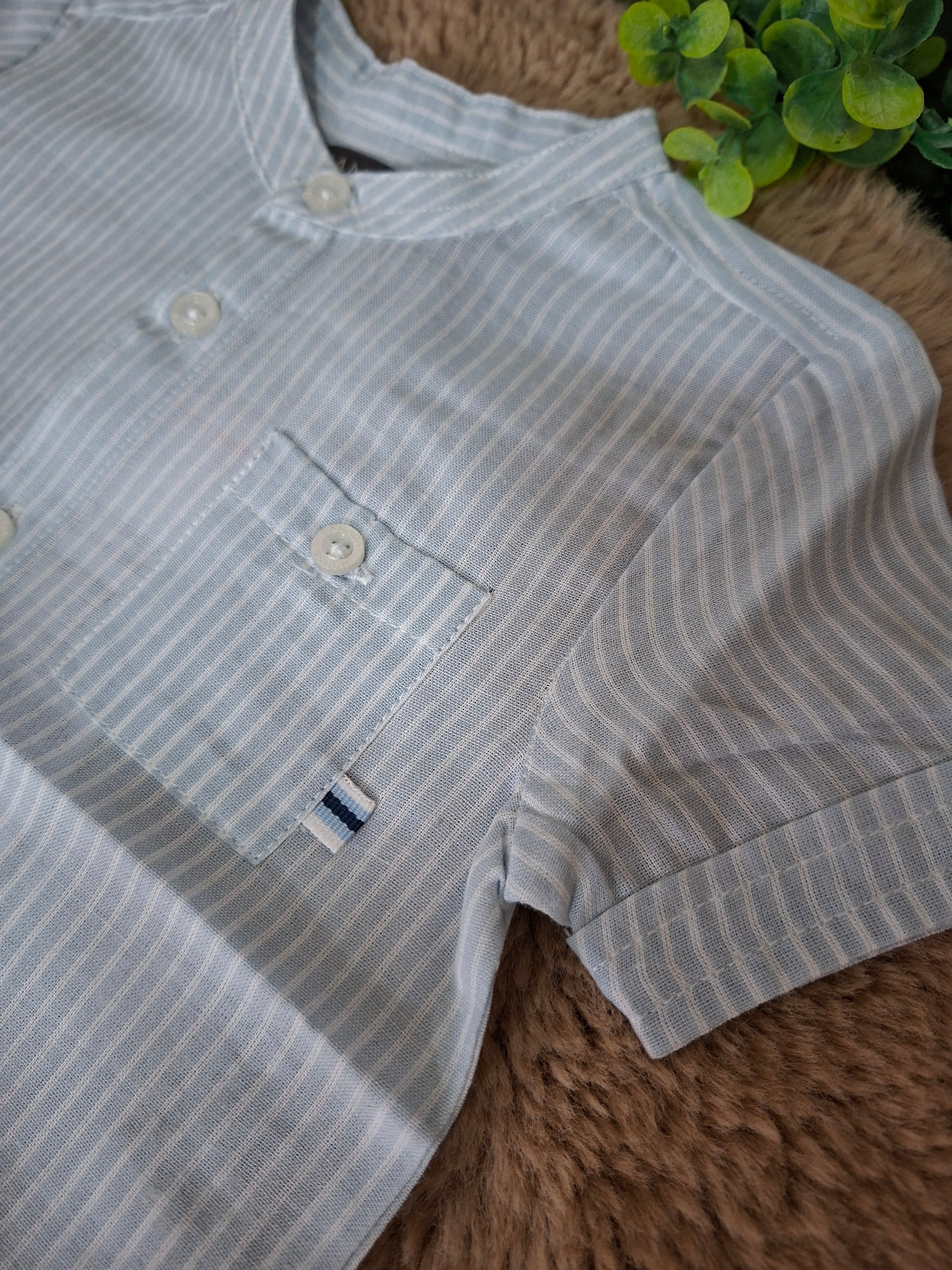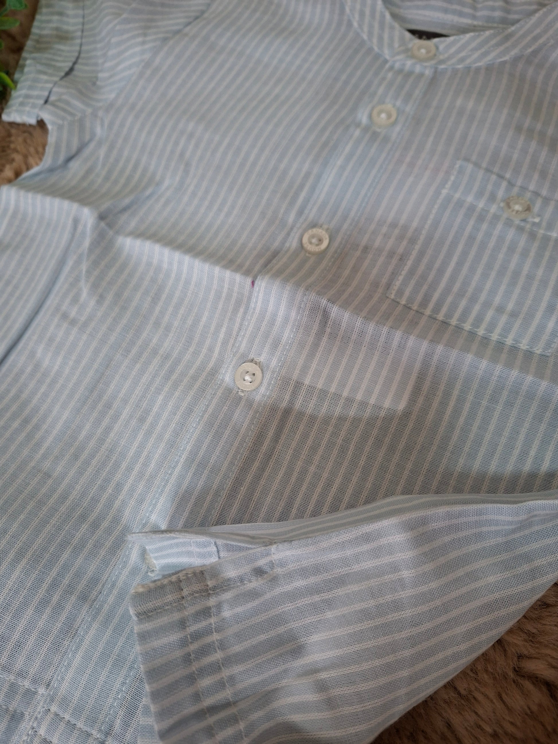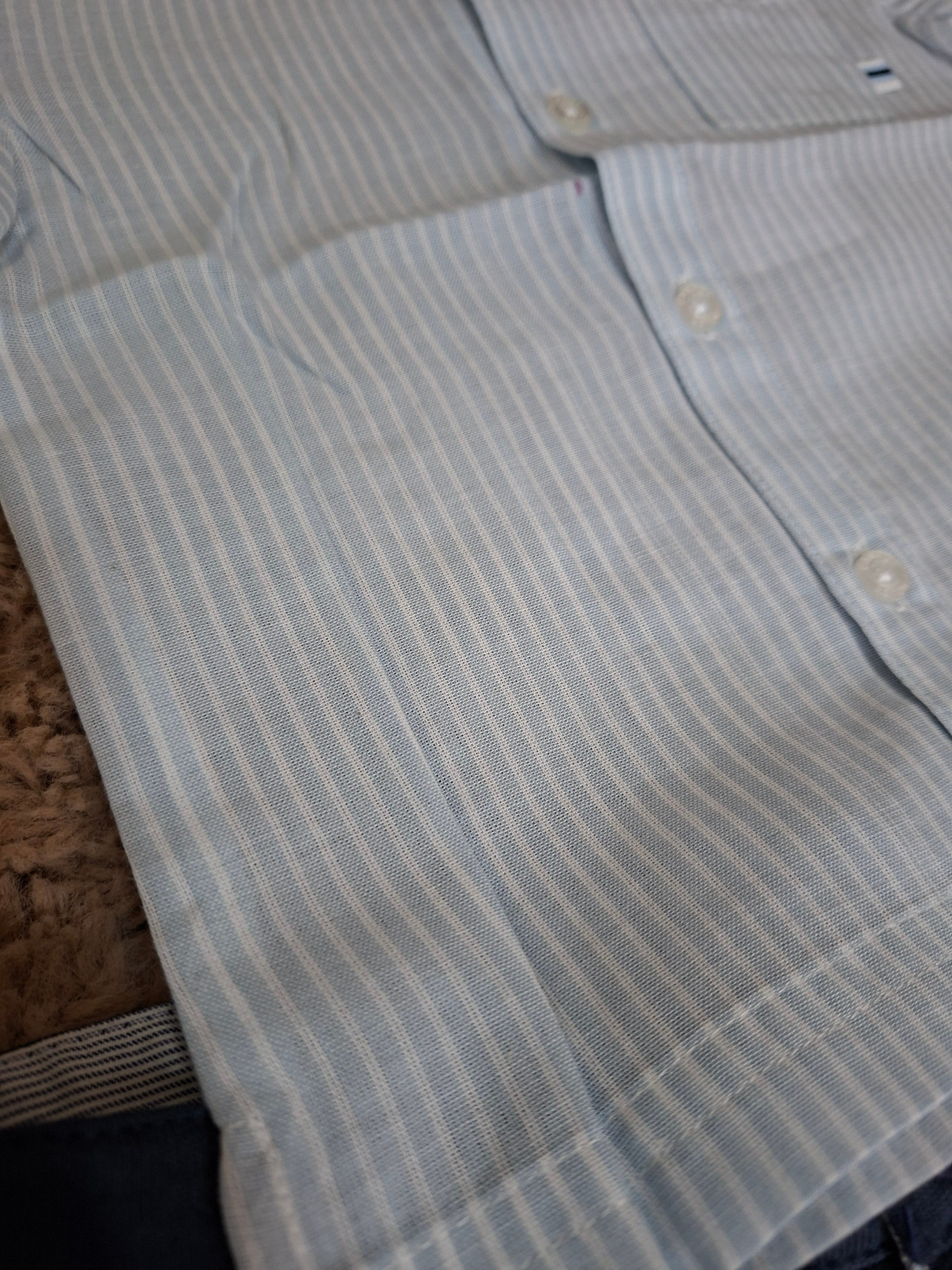 Camicia celeste con strisce bianche.