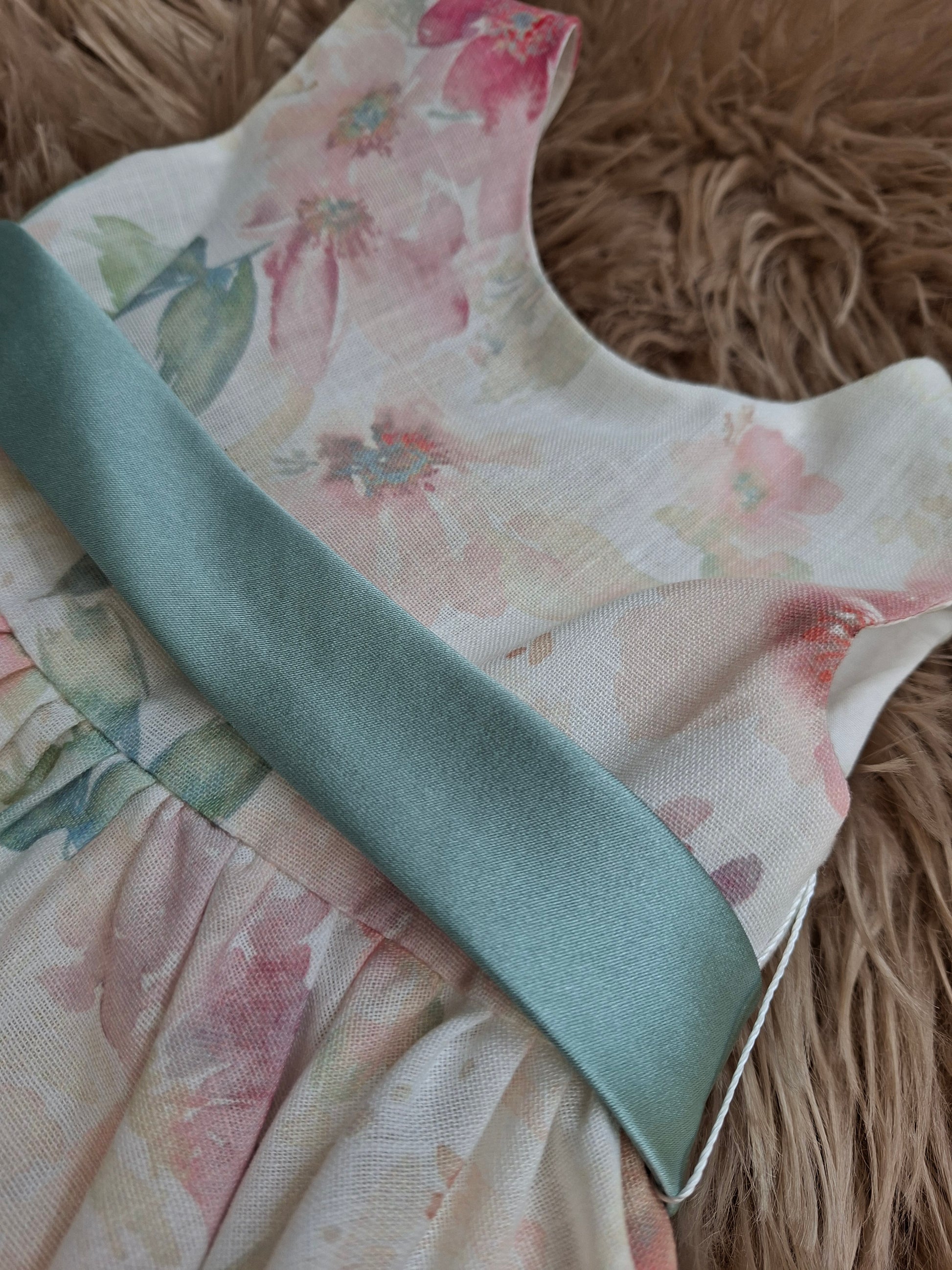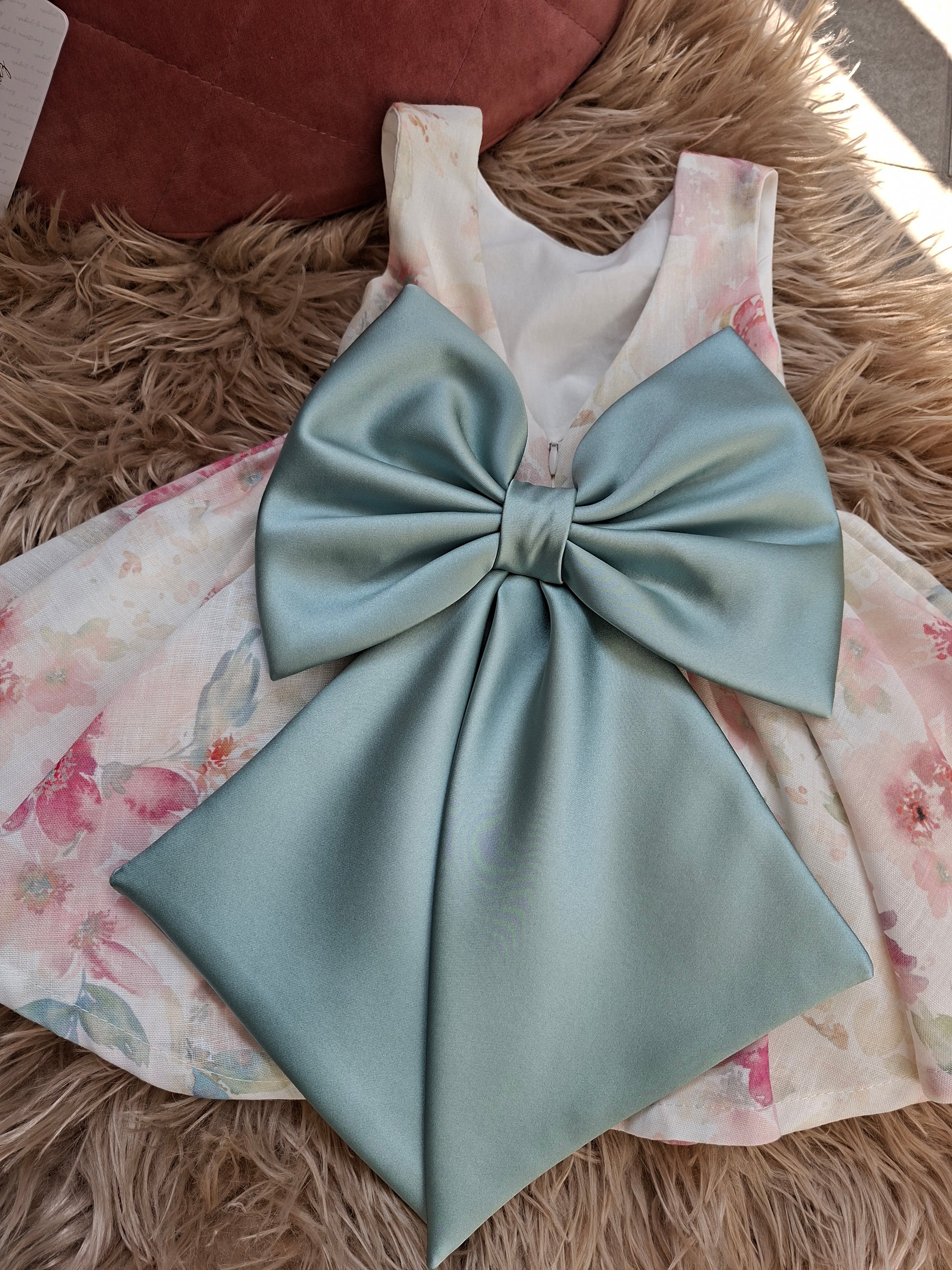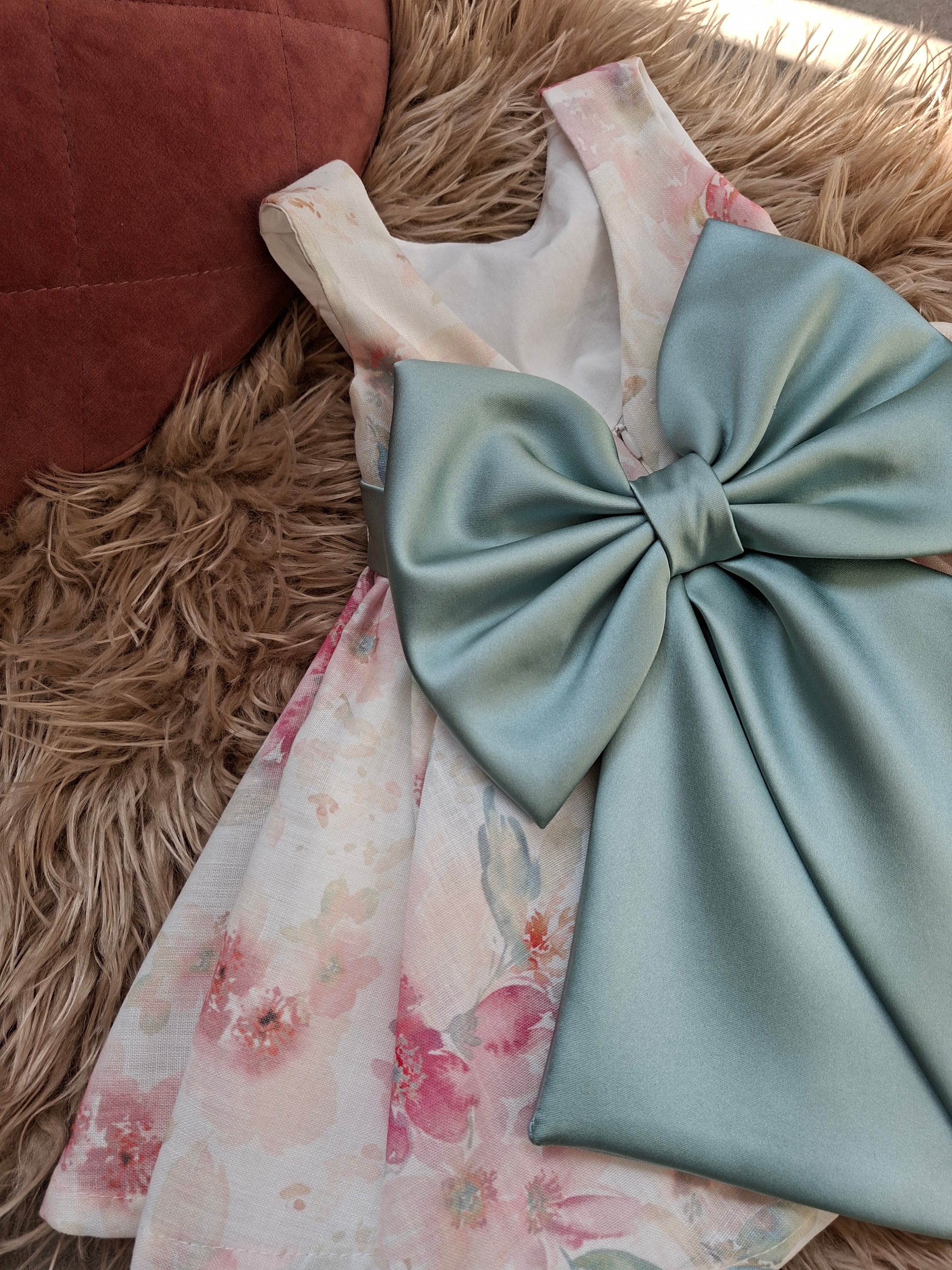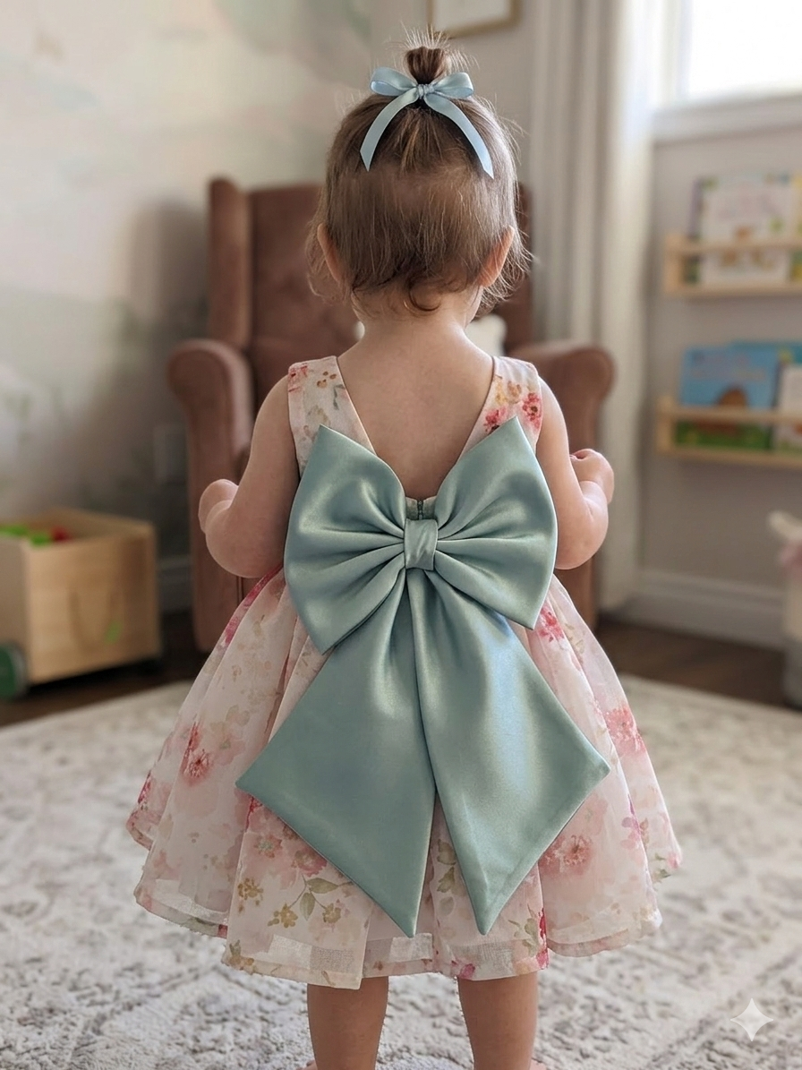 Cinturino in vita e grande fiocco sulla schiena con scollo a V.
