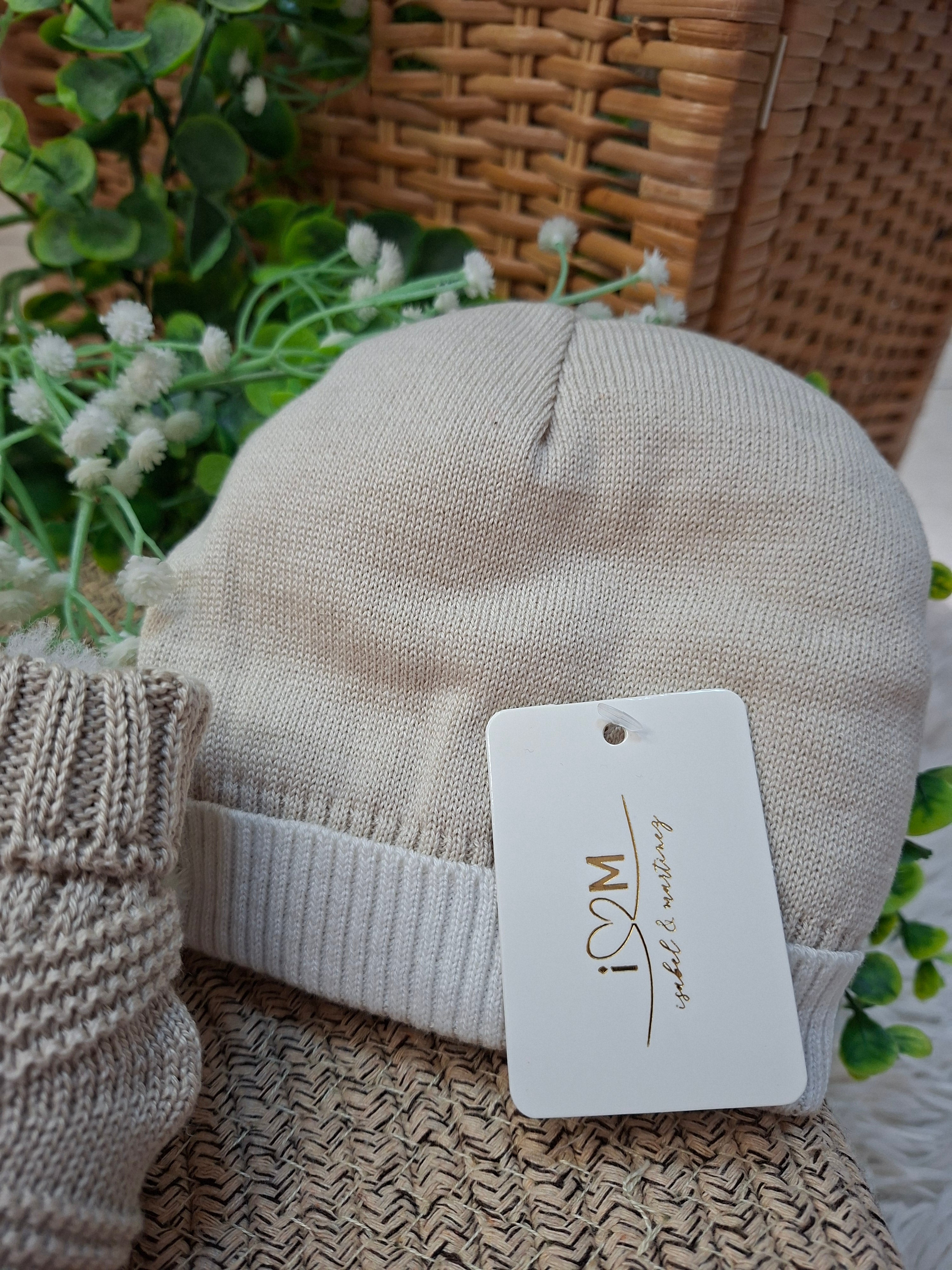 Set cappellino e babucce beje e bianco.