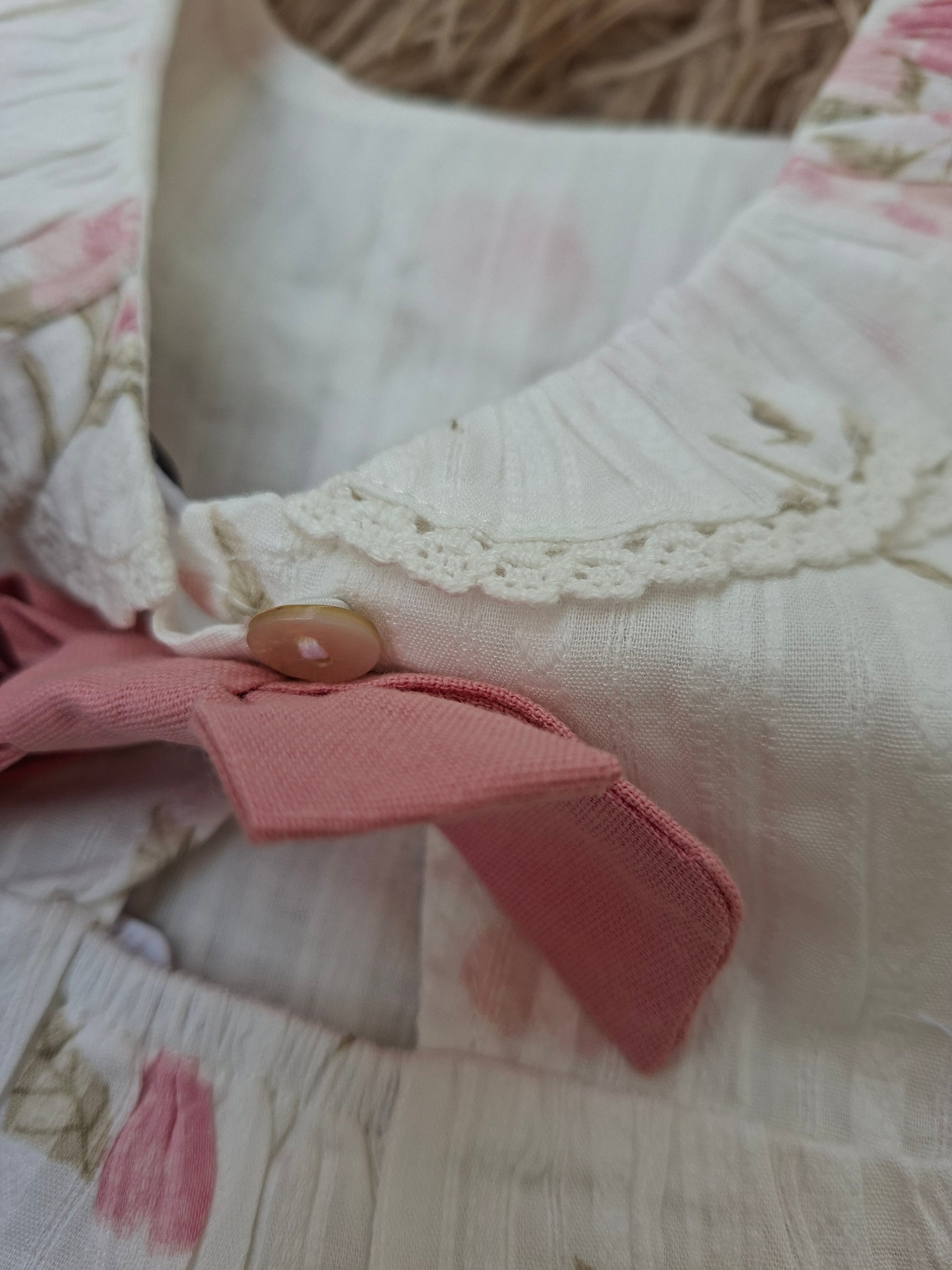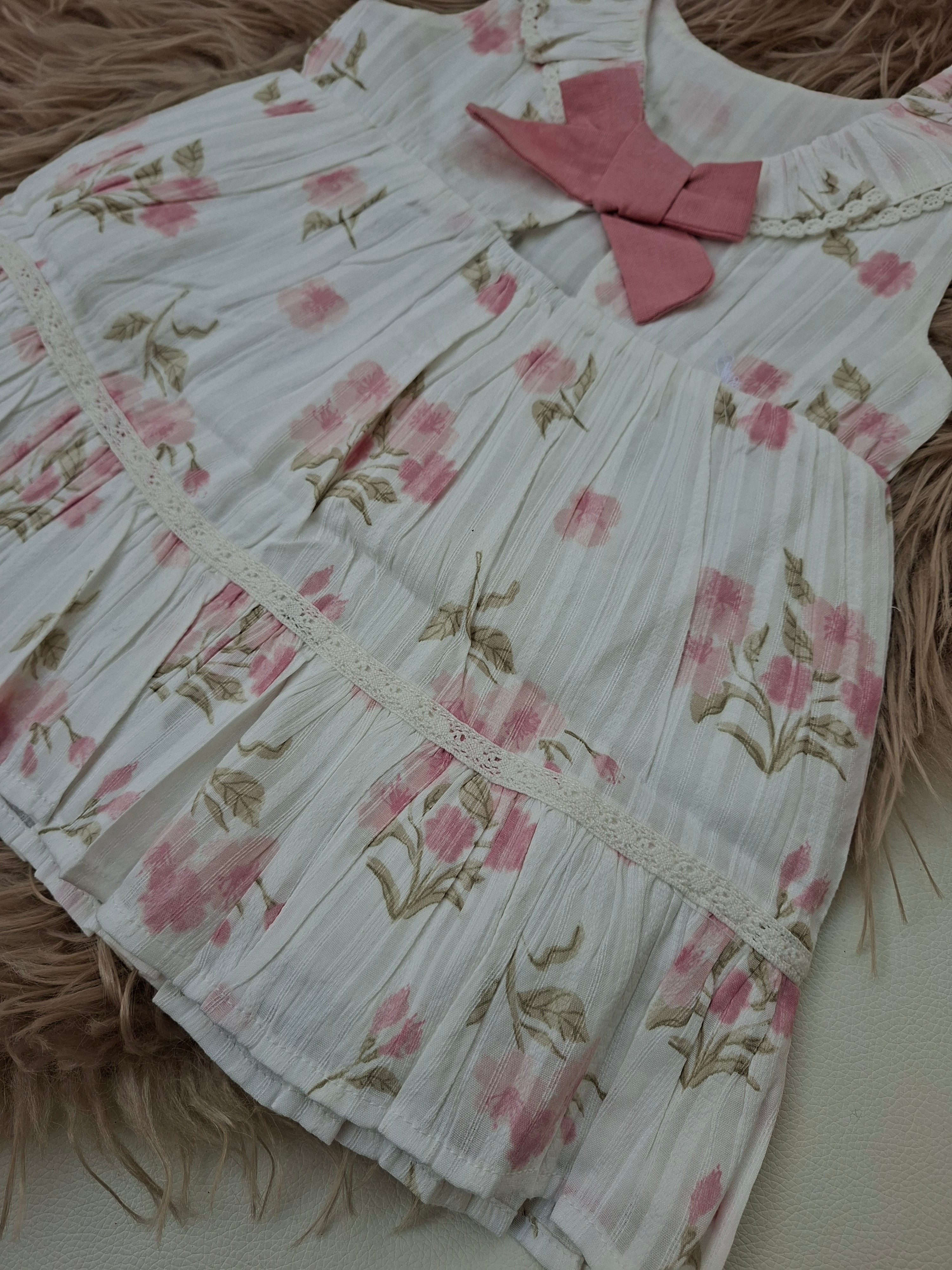 Vestina in cotone con fantasia di fiori e fiocchetto sul petto.